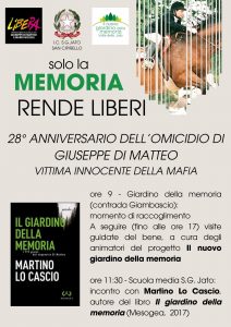 L’11 Gennaio ricorre il 28° anniversario della morte di Giuseppe Di Matteo. Il Giardino della Memoria, luogo della barbara uccisione, sarà aperto dalle 9:00 alle 17:00 per chiunque voglia venire a porgere omaggio o semplicemente fare una visita.
